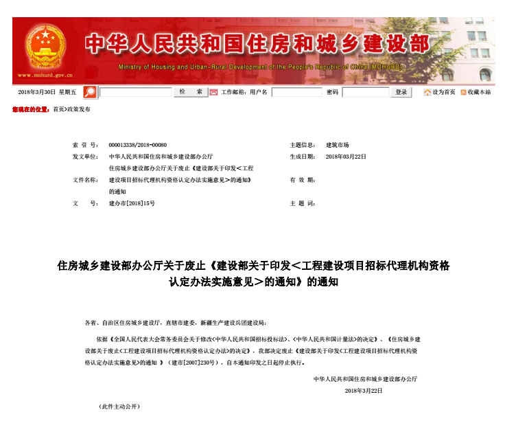 《住房城鄉(xiāng)建設(shè)部關(guān)于廢止<工程建設(shè)項(xiàng)目招標(biāo)代理機(jī)構(gòu)資格認(rèn)定辦法>的決定》已經(jīng)2018年2月12日第37次部常務(wù)會(huì)議審議通過(guò),現(xiàn)予發(fā)布,自發(fā)布之日起施行。