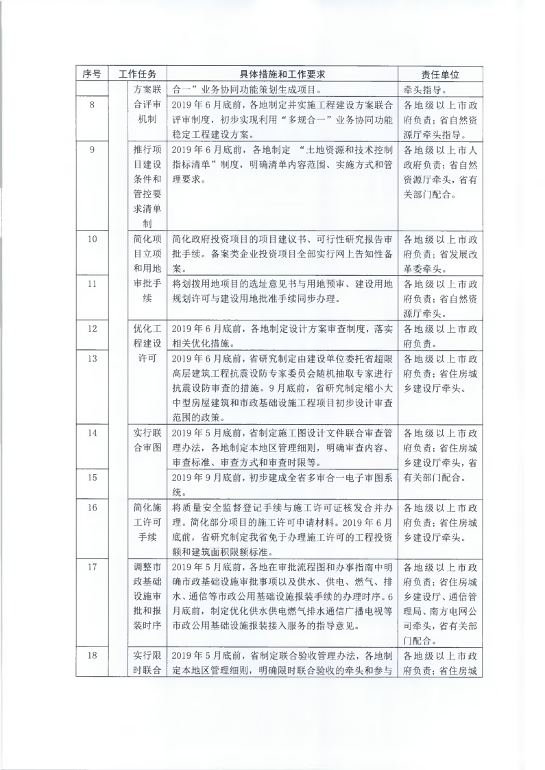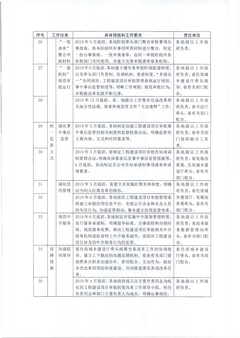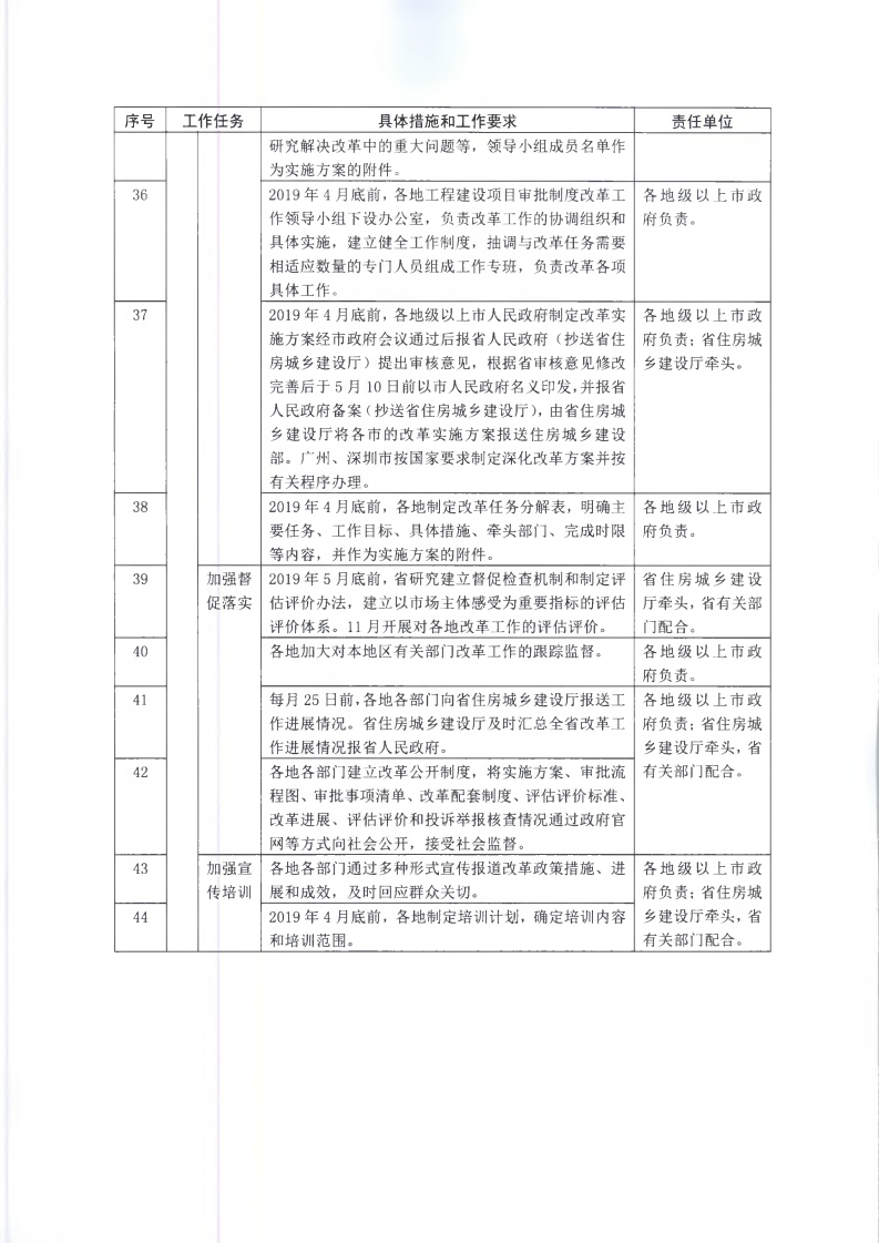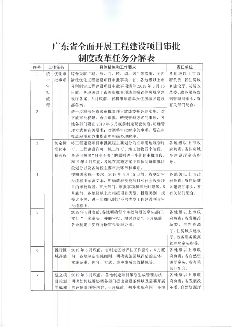 為貫徹落實《國務(wù)院辦公廳關(guān)于全面開展工程建設(shè)項目審批制度改革的實施意見》(國辦發(fā)〔2019〕11號)和《廣東省人民政府關(guān)于印發(fā)廣東省全面開展工程建設(shè)項目審批制度改革實施方案的通知》(粵府〔2019〕49號)要求,經(jīng)省人民政府同意,現(xiàn)將《廣東省全面開展工程建設(shè)項目審批制度改革任務(wù)分解表》印發(fā)給你們,請認真組織實施。